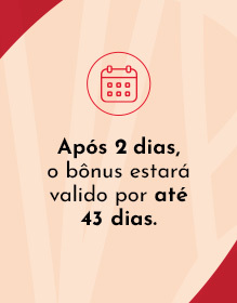 O bônus recebido pelas suas compras fica disponível a partir do terceiro dia da confirmação da sua última compra e pode ser utilizado em até 43 dias corridos a partir do crédito no site, lojas ou WhatsApp. O uso é pessoal e intransferível, não sendo possível a utilização após o vencimento.