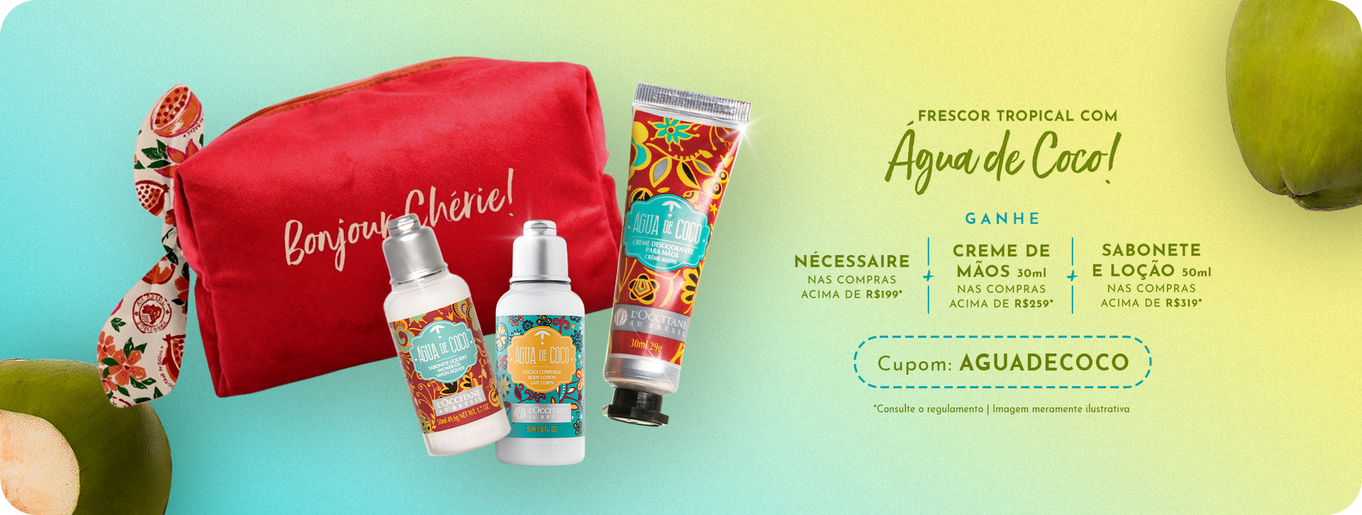 *Válido por tempo limitado ou enquanto durarem os estoques. Oferta não cumulativa com outros cupons, válida em todos os produtos da loja online, exceto com valor promocional e Vale Presente SPA. Válido para uma utilização por CPF. Para participar, insira o código promocional AGUADECOCO no carrinho antes de finalizar a compra. Em caso de troca ou devolução, os brindes devem ser incluídos. A marca se reserva o direito de alterar ou encerrar a promoção sem aviso prévio. Imagem ilustrativa.