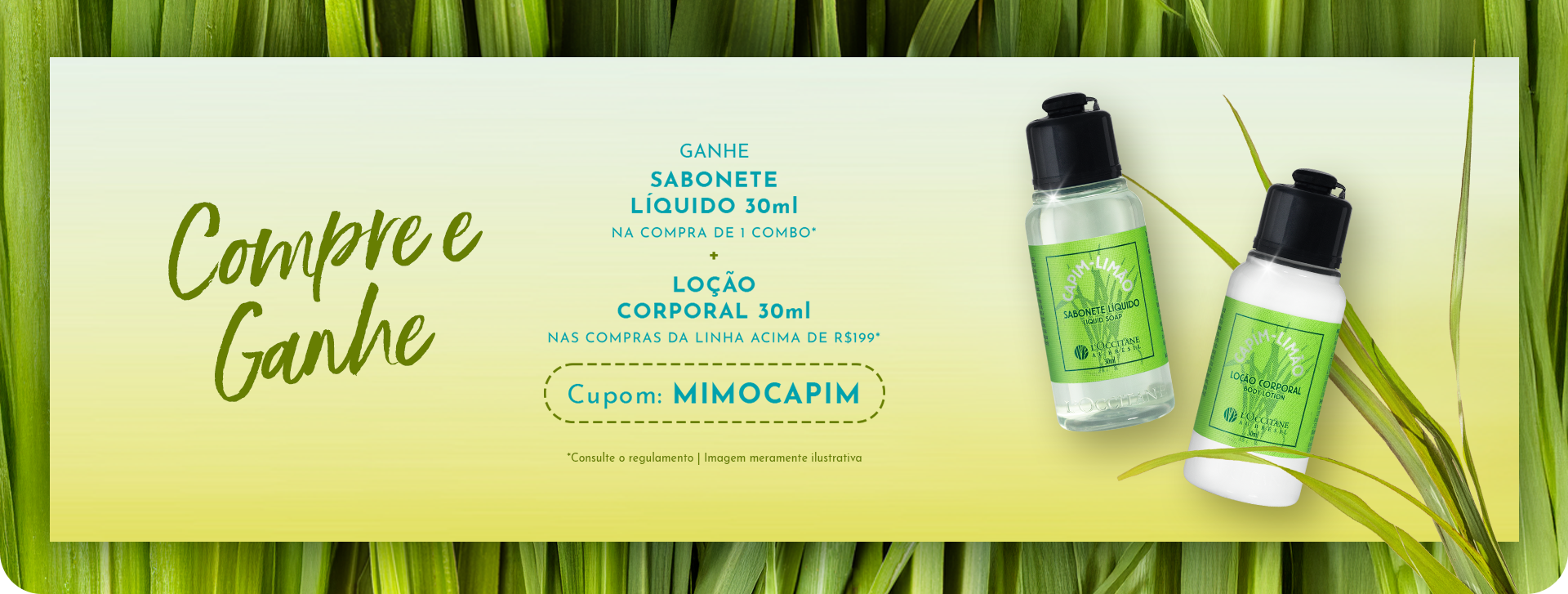 Ganhe Sabonete Líquido 30ml na compra de um dos combos Desodorante e Colônia + Loção 30ml comprando produtos da linha Capim-Limão acima de R$199